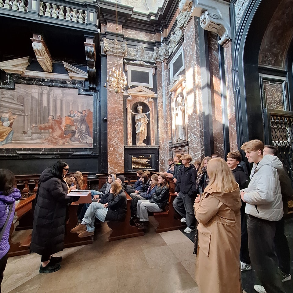 Spalį devintų klasių mokiniai kartu su mokytojomis Andželika ir Lina turėjo unikalią galimybę patirti Renesanso laikų dvasią ir pasivaikščioti dviejų žymiausių Lietuvos istorijoje įsimylėjėlių – Barboros Radvilaitės ir Žygimanto Augusto – keliais. Šiais takais juos vedė charizmatiška Vilniaus pilių valstybinio kultūrinio rezervato direkcijos gidė Nerilė Urbonaitė. Ji ne tik žaismingai patikrino jų turimas žinias „Kahoot“ viktorinoje apie šių kilmingų asmenybių meilę, bet ir atskleidė gimnazistų skaitomos J. Grušo dramos „Barbora Radvilaitė“ kultūrinį ir istorinį kontekstus, panardino į kur kas gilesnį tuo metu išgyventų emocijų, skonių, rafinuotų slaptų susitikimų vingius.