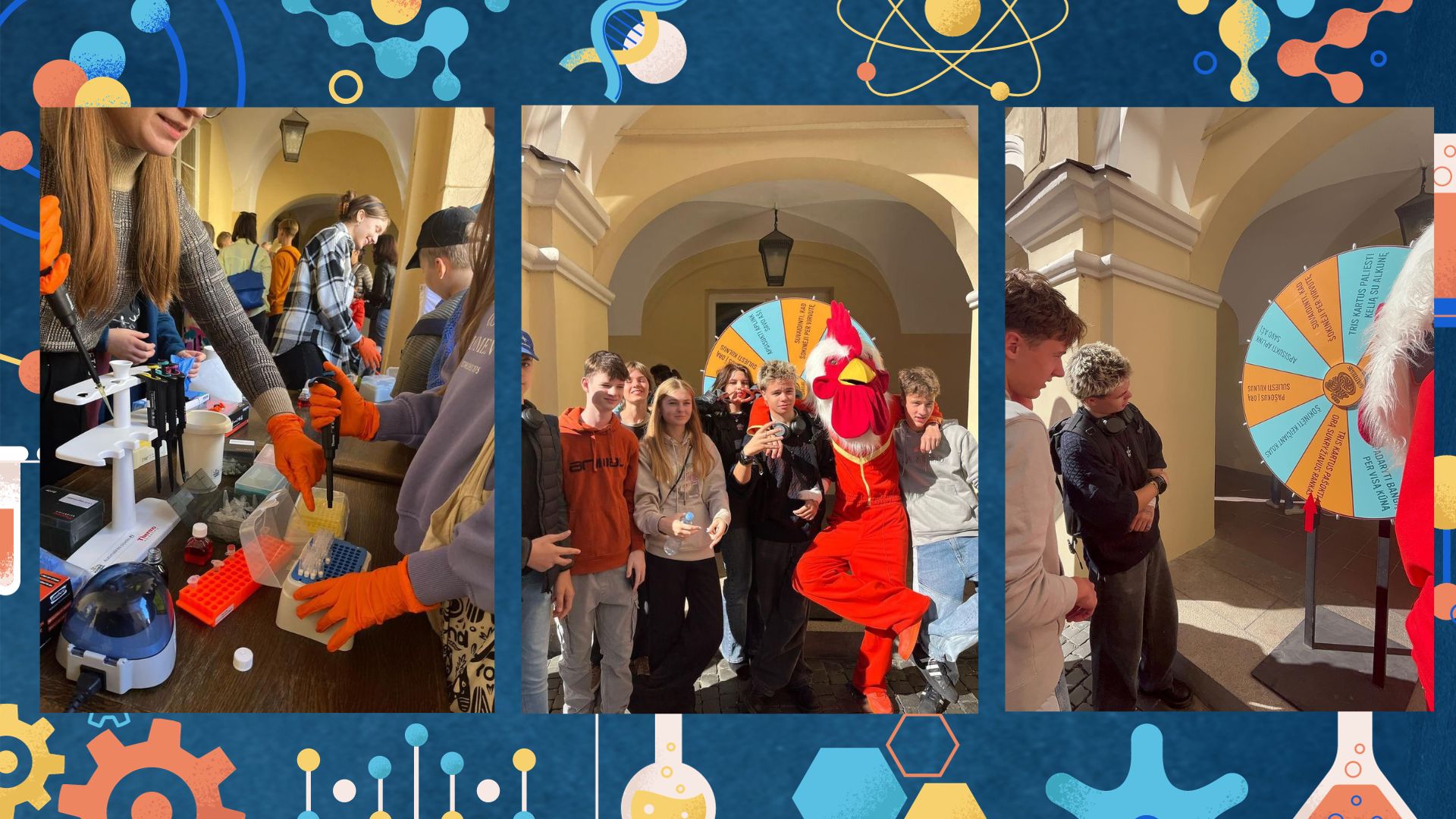 Rugsėjo 16 dieną biochemijos profilio mokiniai drauge su mokytoja Danguole Skladaitiene vyko į Vaikų universiteto festivalio atidarymo renginį „Mokslo magija“. Nors ir teko anksčiau atsikelti šeštadienio rytą, bet tai netrukdė smagiai ir produktyviai praleisti laiko. Vilniaus universiteto organizuotoje mokslo šventėje buvo gausu teminių stendų, kuriuose ne tik išbandėme įvairias pramogas, bet ir įgijome naujų patirčių.