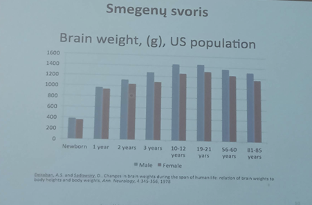 Birželio 5 dieną su biochemijos profiliu ir mokytoja Danguole Skladaitiene keliavome klausytis įdomios paskaitos Vilniaus Universiteto Gyvybės mokslų centre tema „Kokia smegenų lytis?“ Pirmiausia aptarėme, kas apskritai yra lytis, tada smegenų skirtumus ir galiausiai smegenų jutimų skirtumus tarp moterų ir vyrų. Pagal statistiką vyrų smegenys yra šiek tiek sunkesnės nei moterų. Kuo smegenyse daugiau neuronų, tuo jos sunkesnės, tačiau svarbiau yra tai, kaip tos nervinės ląstelės bendrauja tarpusavyje. Mažesnis kiekis bendraujančių neuronų gali padaryti daug daugiau nei didesnis kiekis nebendraujančių neuronų.