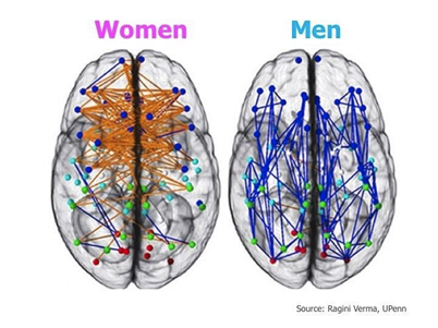 Skirtingų lyčių smegenų iliustracijoje galime matyti, kad moterų abu pusrutuliai komunikuoja daugiau negu vyrų, jų pasiskirstę po visas smegenis tolygiai. Taip pat dar ir buvo paminėta, kad vyrų smegenys didesnės, sunkesnės, turi daugiau neuronų, tačiau moterų neuronai didesni.