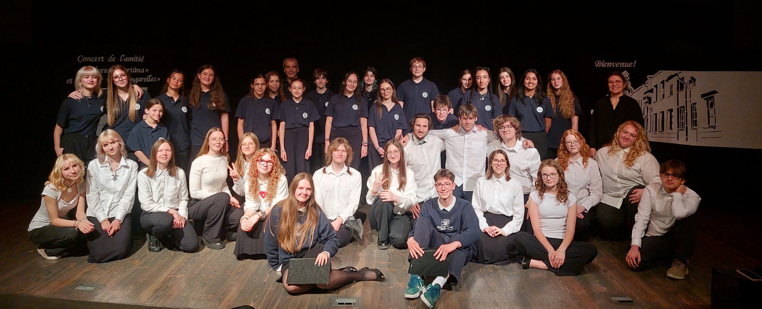 Dar prieš koncertą tarp svečių ir mūsų mokinių užsimezgė draugiški ryšiai – gimnazijos mišraus choro „Fortūna“ choristai kartu su prancūzų kalbos besimokančiais mokiniais dalyvavo pažintinėje programoje: žaidė interaktyvius susipažinimo žaidimus, šoko lietuvių folklorinius šokius, kuriuos vedė meno vadovė Audronė Stanienė.
