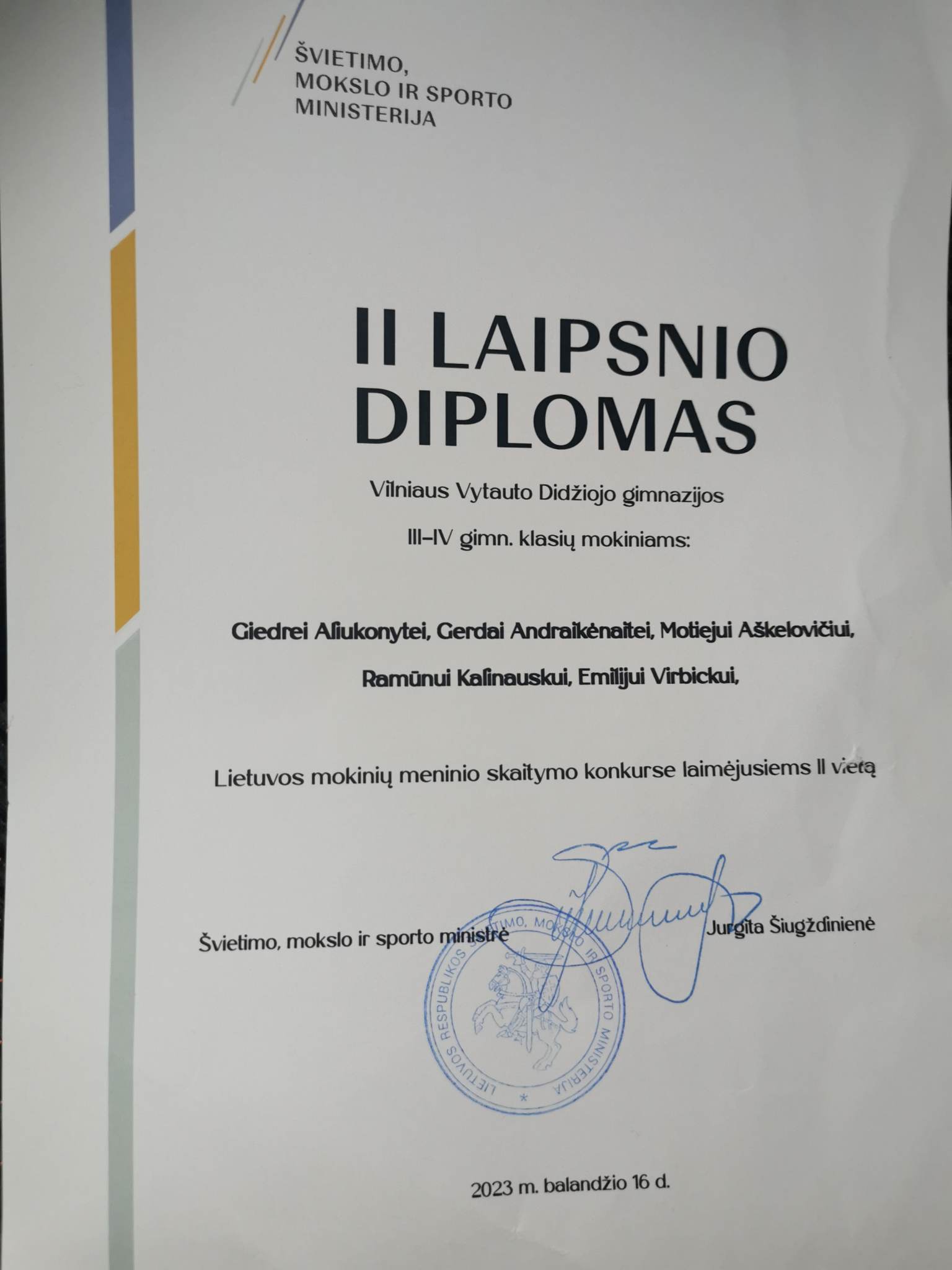 Vilniaus Vytauto Didžiojo gimnazijos literatūrinė kompozicija „Viešpatie, ką žmonės pagalvos!”(pagal Gintaro Grajausko, Dovydo Grajausko, Vlado Šimkaus kūrybą) Lietuvos mokinių meninio skaitymo konkurse, kuris vyko balandžio 15–16 dienomis Palangos V. Jurgučio progimnazijoje, laimėjo II vietą.