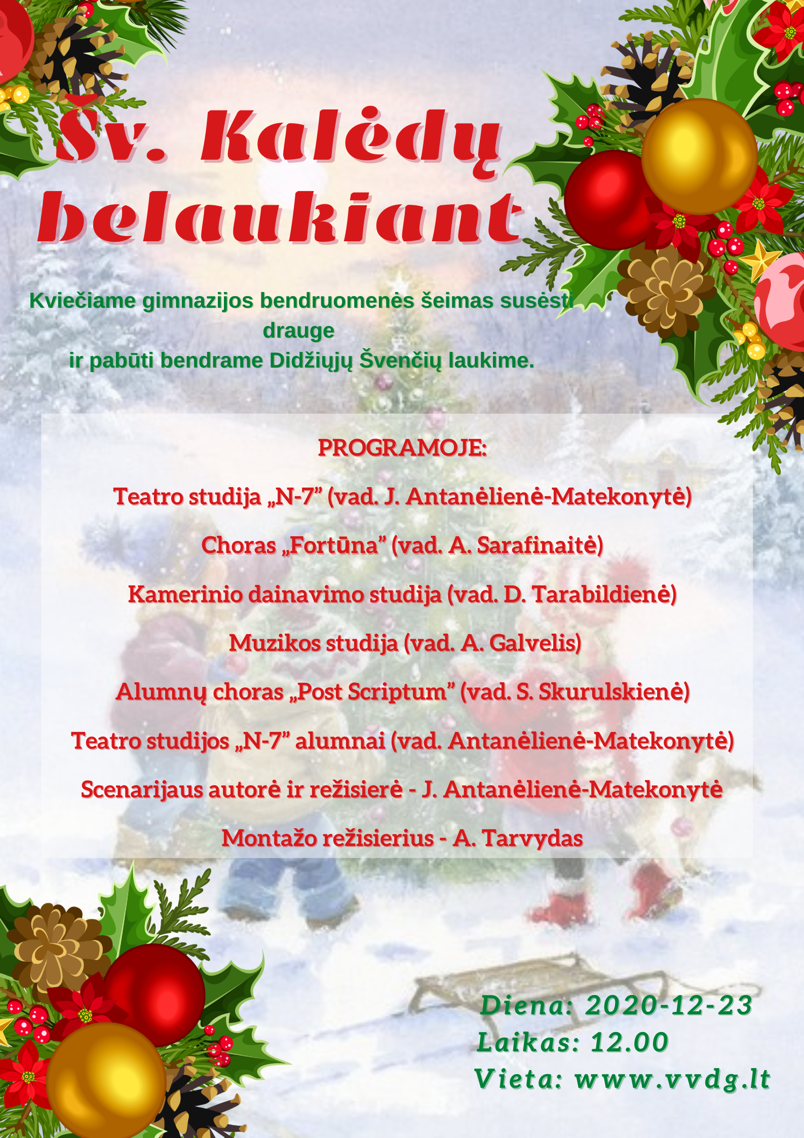 Mieli gimnazijos bendruomenės nariai, kviečiame jus visus drauge stebėti gimnazijos menų kolektyvų parengtą nuotolinį šventinį koncertą, kuriame pamatysime ne tik puikiai pasirodysiančius gimnazijos mokinius ir mokytojus, tačiau ir sužinosime apie lietuviškas Šv. Kalėdų tradicijas.