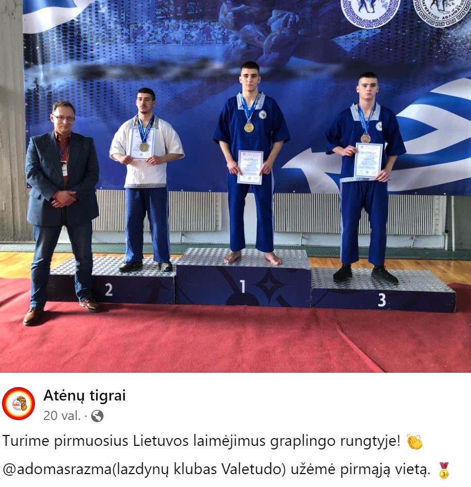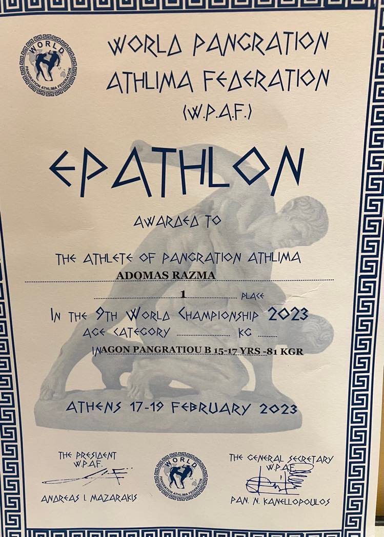Graikijoje Pasaulio Pankrationo/Graplingo čempionate, kuriame dalyvavo sportininkai iš 47 pasaulio šalių, mūsų gimnazijos mokinys Adomas Razma (III B kl.) šiame pasauliniame sporto renginyje iškovojo du aukso medalius ir tapo Pasaulio pankrationo ( bokso ir graikų imtynių sintezė) ir graplingo (dziudo, sambo ir kt.) jaunimo čempionu.