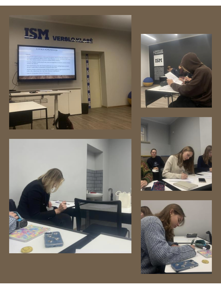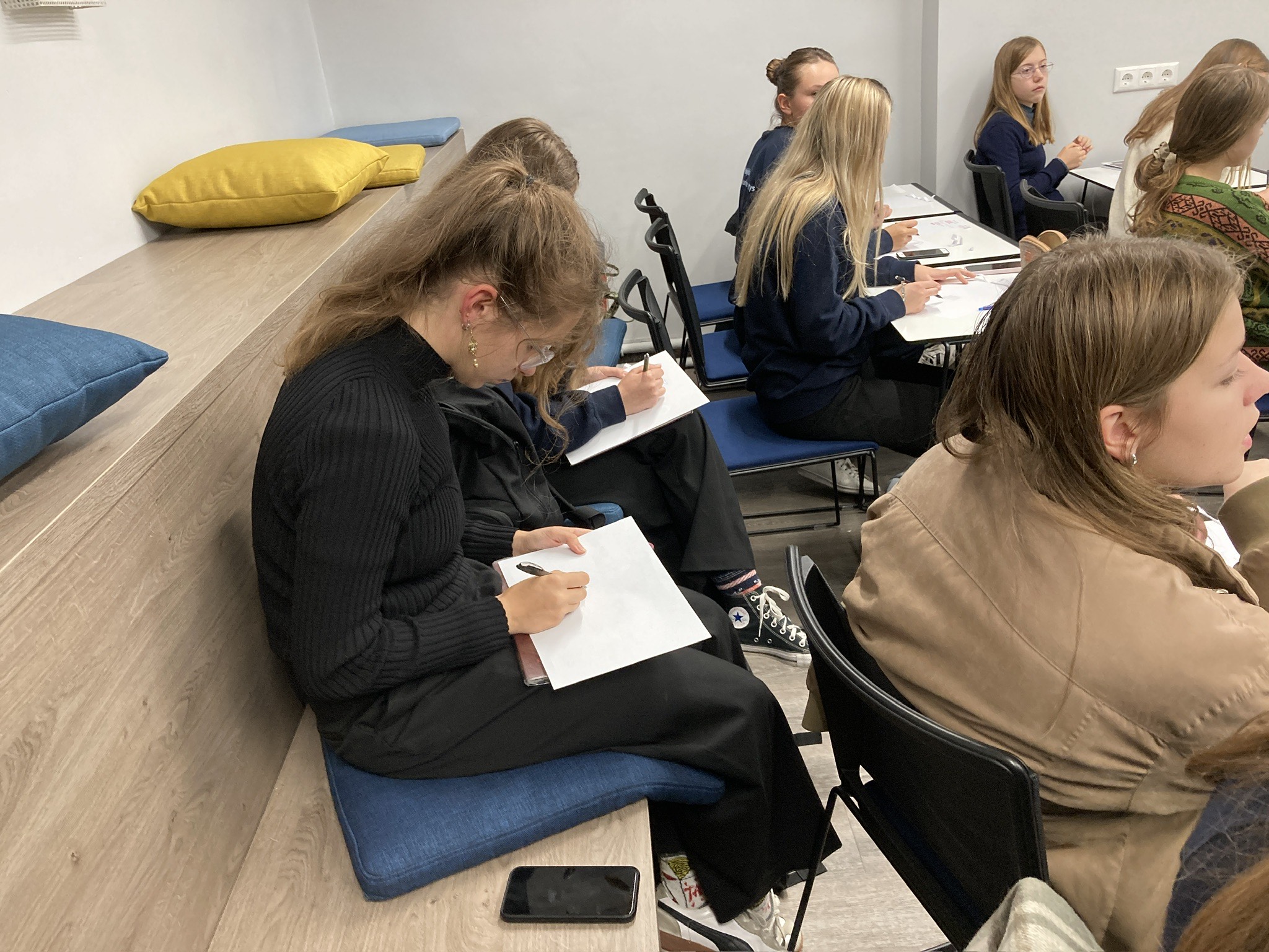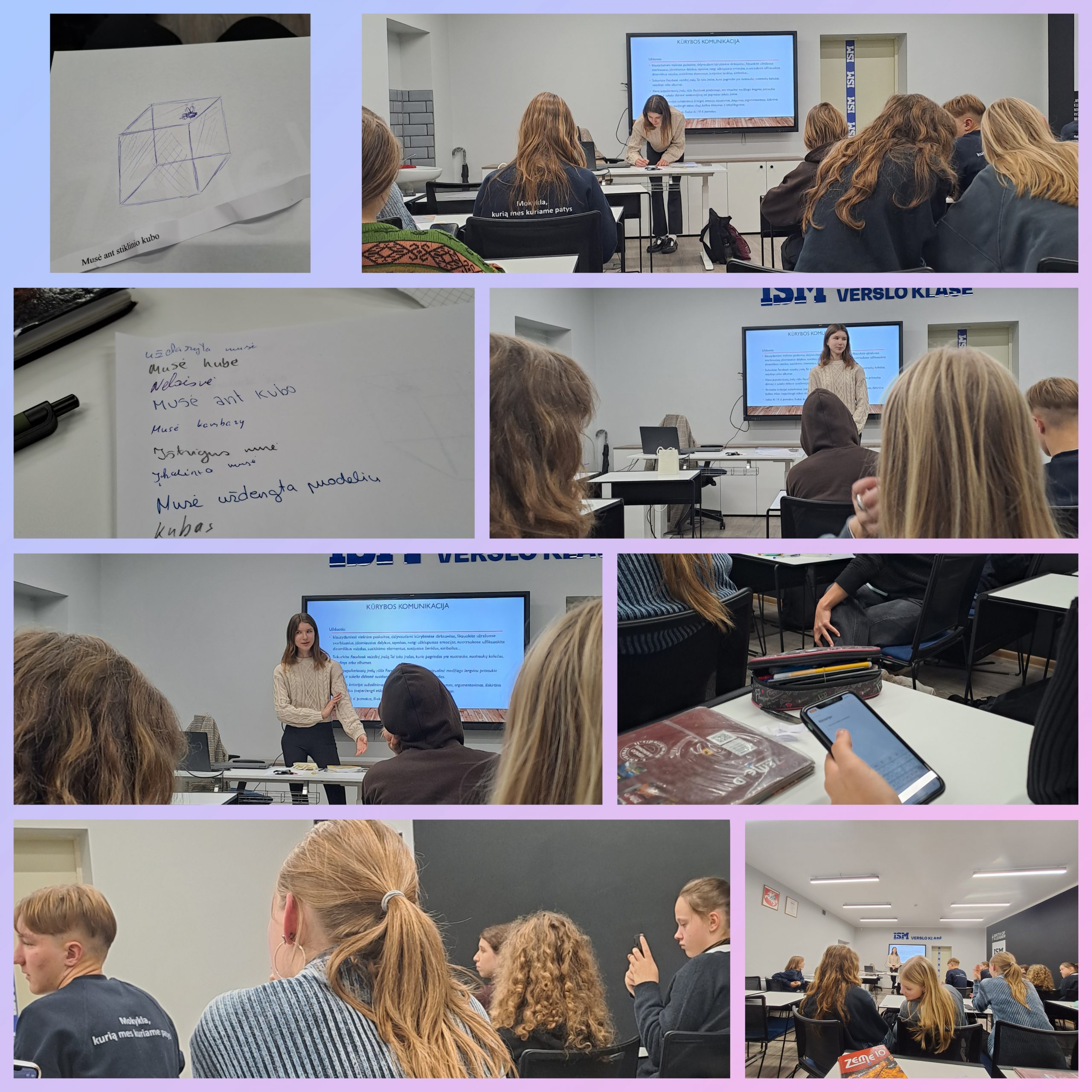 Visą pamoką klasėje tvyrojo susidomėjimo ir smalsumo nuotaika. Atmosfera buvo nuostabi – kūrybinės dirbtuvės ir bendravimas pralinksmino mokinius bei pačias mokytojas, sužadino fantaziją ir paskatino kurti bei dalintis mintimis. Veiklų metu studentė pasakojo apie kūrybišką komunikaciją ir savo studijas. Klausytojai buvo susikoncentravę, negalėjo atitraukti akių nuo Aistės. Kiekvieno galvoje sukosi spiečius minčių – kokia įdomi ir neįprasta gali būti komunikacijos modulio pamoka. Kasdienybėje komunikuojame su kitais, tačiau pamokos metu turėjome pažvelgti į savo vidinį pasaulį ir padirbėti su savimi, pagalvoję įvardinome savo teigiamas ir neigiamas savybes, pažvelgėme į jas atidžiau, pabandėme rasti joms pritaikymo būdų.