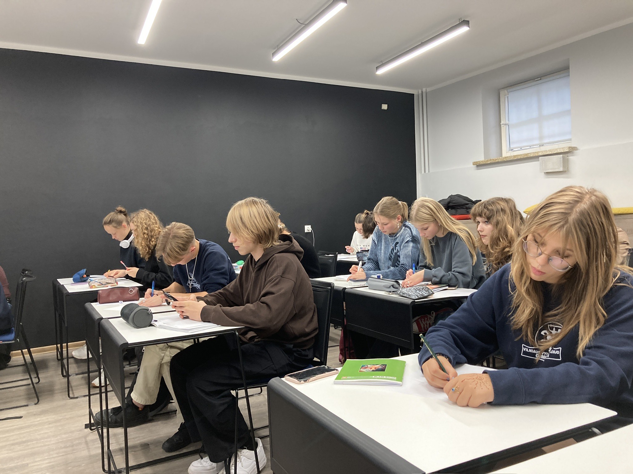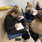 „Trečiadienį žinojau, kad ši pamoka vyks kitaip. Įėjus pamačiau, kad paskaita mums bus vedama su vyresne klase, juos buvo smalsu pamatyti, nes iš tiesų nebuvau pagalvojus apie kitus mokinius už mūsų klasės ribų, kuriuos irgi domina komunikacija. Viską mums vedė mergina, kuri pati dar neseniai mokėsi VVDG, o dabar studijuoja Vilniaus universitete. Aš labai vertinu tai, kad ji mums – jauniems komunikatoriams – nori perteikti savo žinių ir net daugiau sudominti, ką tikrai padarė. Pamokoje pačios veiklos buvo nepaprastos ir nuoširdžiai įdomios. Viena, kuri man įstrigo, buvo, kai gavome lapelį su kažkokiu daiktu, jį turėjom pavaizduoti ant lapo ir vėliau siųsti kitiems, kurie turi išsiaiškinti, kas nupiešta. Dėkoju už šį prisiminimą ir jau nekantraudama laukiu kitos komunikacijos pamokos.“ – Elena I e