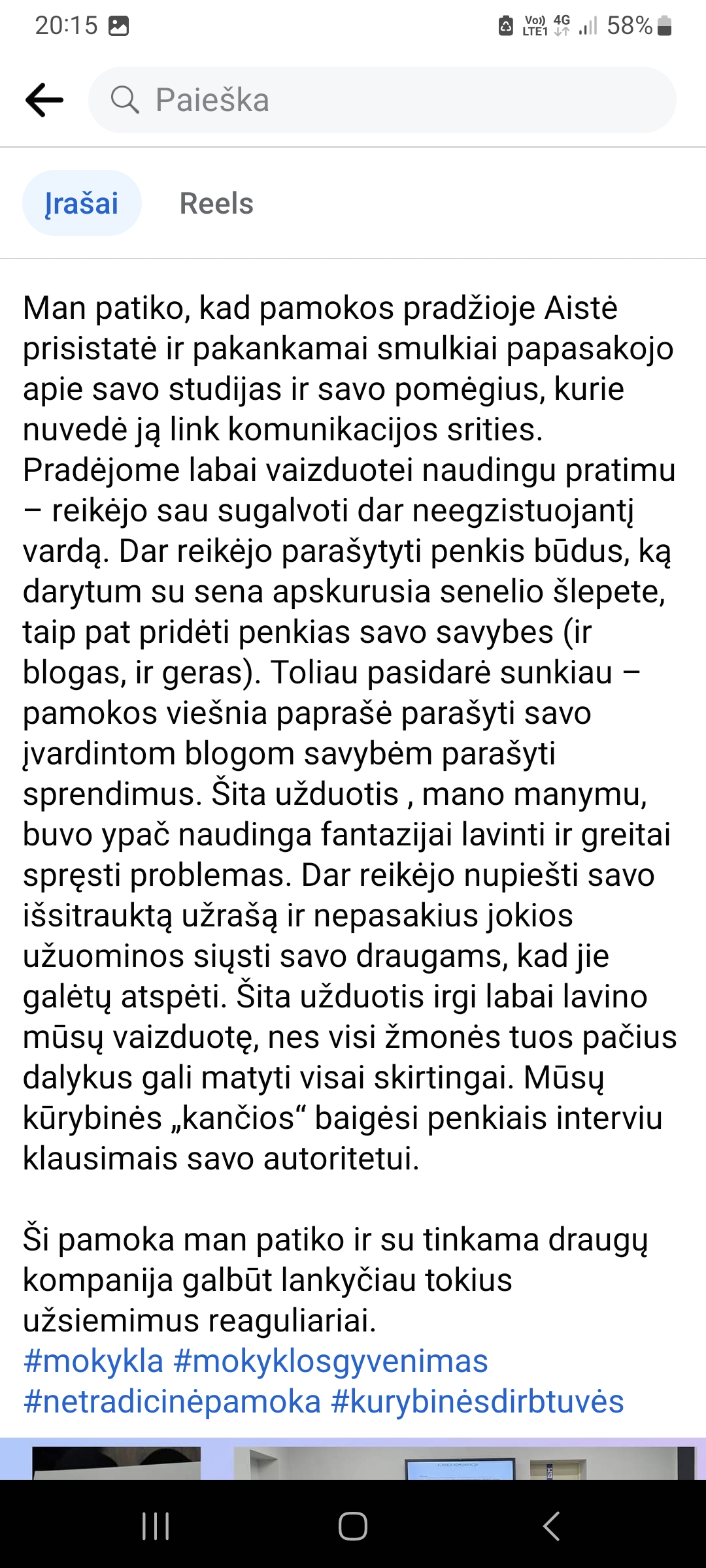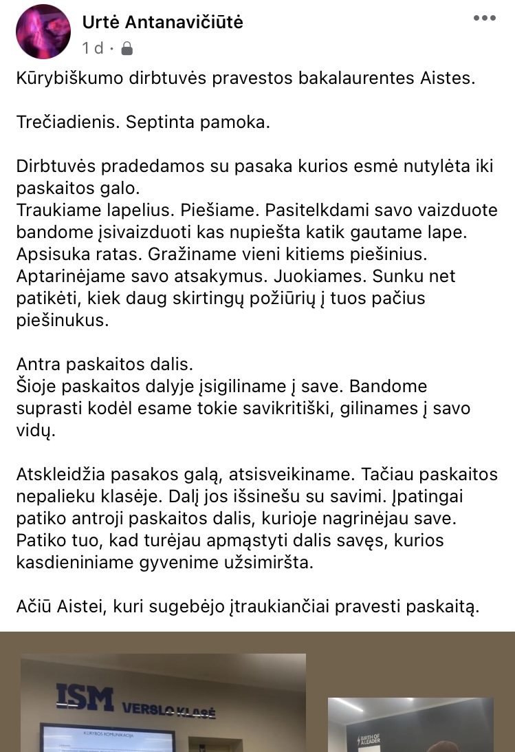 „Kūryba yra menas. Komunikacija yra kalba. Ar tai reiškia, kad kūrybos komunikacija yra meninis kalbėjimas? Nežinau. Tokios mintys man sukosi porą sekundžių, kai buvo pristatyta šiandienos tema. Ir vis dėl to buvo įdomu, nes jaučiausi lyg įtrūkusi iš rutinos ir kažką naujo atrandanti. Keistas jausmas. Tarsi būtum po vandeniu ir retkarčiais iškeltum galvą virš vandens, įkvėptum ir vėl panirtum. Nesitikėjau kažko įdomaus, bet mane ši pamoka nustebino. Komunikacijos bakalaurantė Aistė pateikė daugybę kūrybinių užduočių. Ar sugebėtum nupiešti kavos tirščius? Ką apie tavo piešinį pamanytų kiti? Gal kad tai – smėlis? Keista užduotis, ar ne? Iš tikrųjų ši ir kitos panašios kūrybinės užduotys buvo nuostabios, nes paskui aš suvokiau, kad nors mes esame žmonės – mąstome ir matome skirtingai. Tai buvo įdomios pamokos rezultatas. Iš tikrųjų aš džiaugiuosi, kad per kūrybines pamokas galima padaryti išvadas, kurios tikrai pravers darant projektinį darbą.“ – Rasa I e