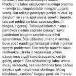 „Pamoka virto performansu, kuriame turėjome įdomius vaidmenis. Susigalvojome sau naujus, originalius vardus, kuriais vieni kitus vadinome likusią pamoką. Išsidalinome lapelius su užrašyta žodžių kombinacija ir ją turėjome nupiešti ant balto popieriaus lapo. Pabaigę savo kūrinį, keitėmės lapais ir turėjome spėti, kas buvo nupiešta kitoje pusėje. Atgavę savo originalų darbą smagiai skaitėme draugų spėliojimus. Šioms 45 minutėms pasibaigus, supratau, kad pamokos ne visada būna nuobodžios, per jas tikrai galima pasijuokti ir išmokti naujų dalykų! Dėkoju mokytojoms, kurios moka pamokas paversti turiningas“. – Evelina II c