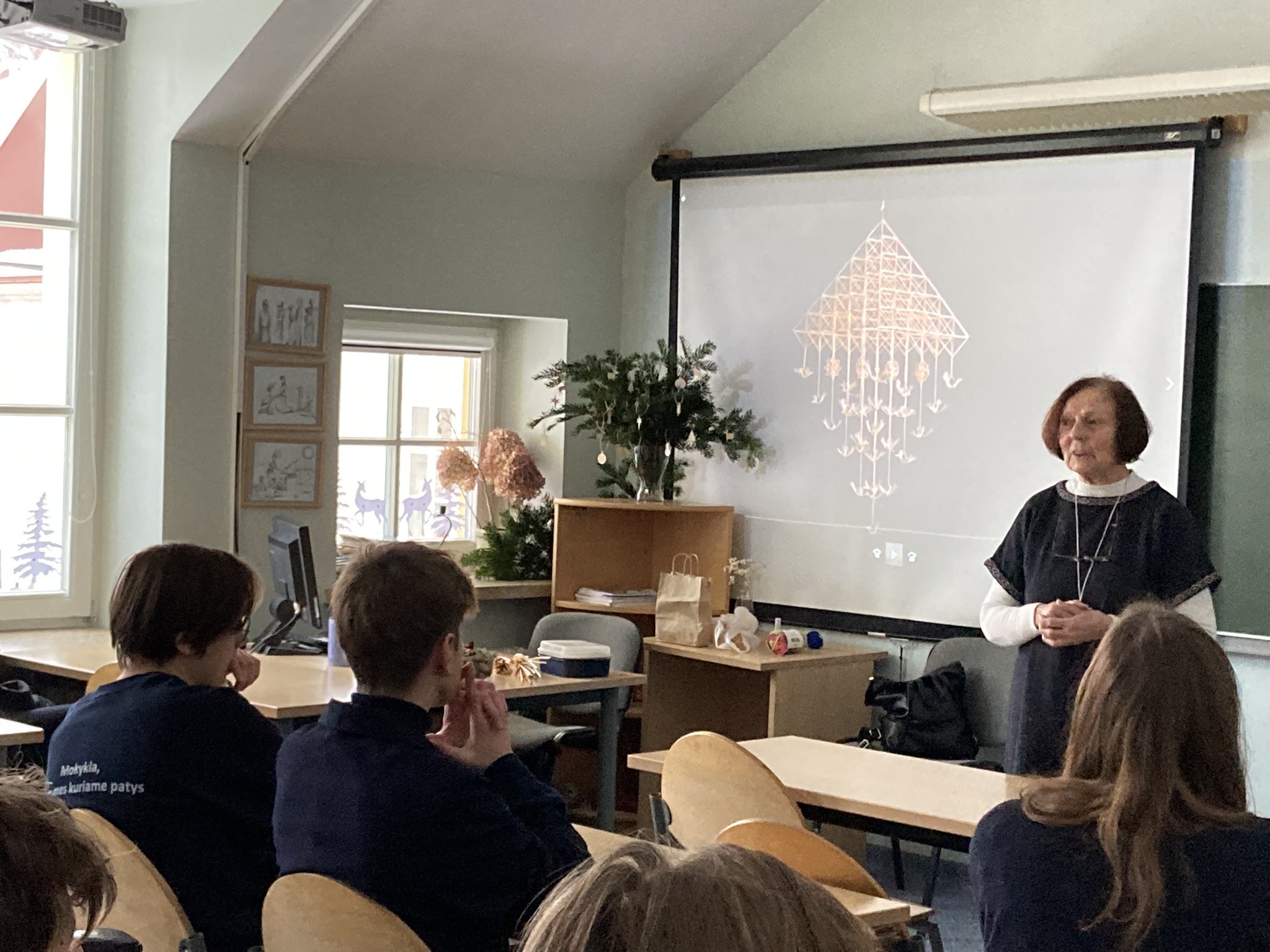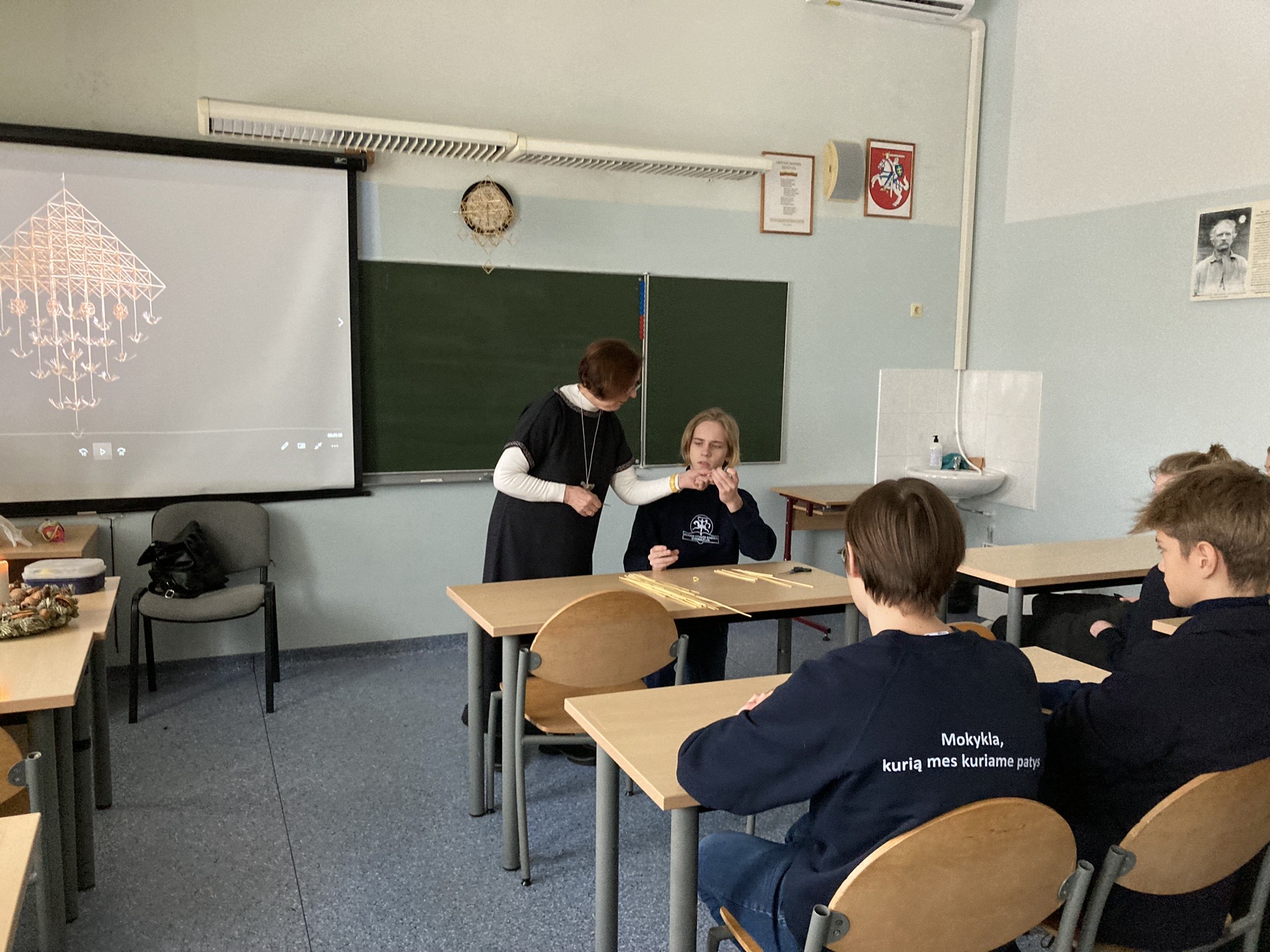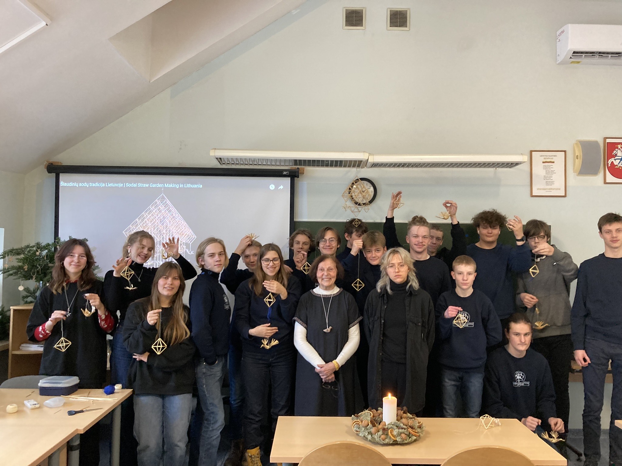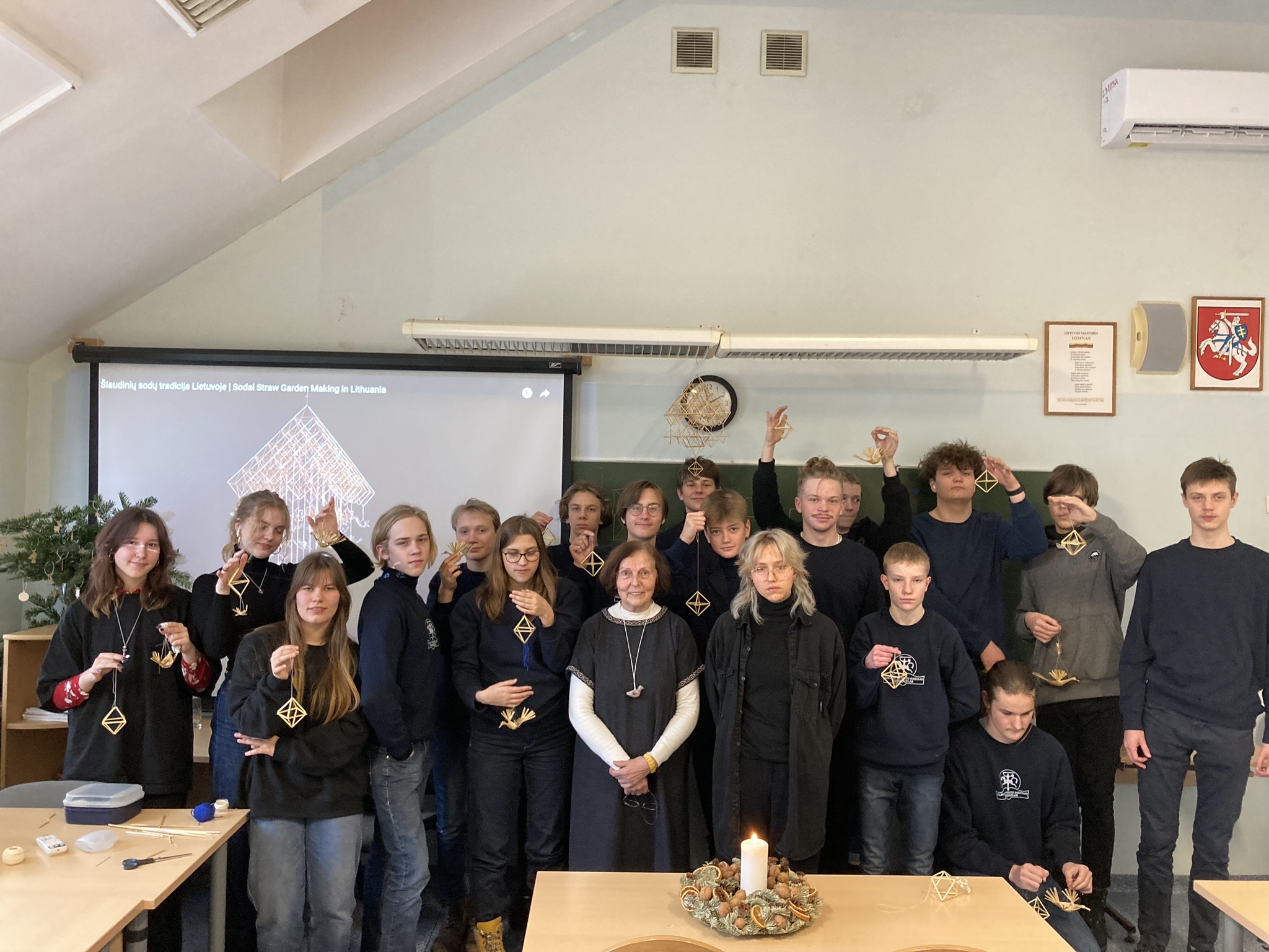Nepaprastai džiugu ir vertinga, kai mūsų gimnazistų šeimos nariai, įsitraukdami į ugdymą, ne tik supažindina jaunus žmones su tautiniu paveldu, bet ir perduoda tradicijas, paskatina jomis domėtis plačiau. Netradicinėje lietuvių kalbos ir literatūros pamokoje viešėjo asociacijos „Dangaus sodai“ vadovė Marija Liugienė, mūsų mokinio močiutė, jaunuolius nustebinusi įteikdama patirties dovaną – tautodailininkė perdavė šiaudinių sodų pynimo tradicijas. O jos reikšmingos – Lietuva pateikė šiaudinių sodų tradicijos nominacinę paraišką UNESCO Reprezentatyviajam žmonijos nematerialaus kultūros paveldo sąrašui. Mokiniai užburti klausėsi M. Liugienės pasakojimo apie vieną iš tautodailės rūšių, kurioje užkoduota visa senovės baltų pasaulėjauta, vėliau karpė, rišo ir stebėjo, kaip užburiančiai sūpuojasi jų pačių suverti sodai. Svarbiausia tai, kad buvo juntamas tylus jaunuolių pasididžiavimas ne tik pasiektu rezultatu, bet ir tuo, kad jie yra šio unikalaus meno paveldėtojai.