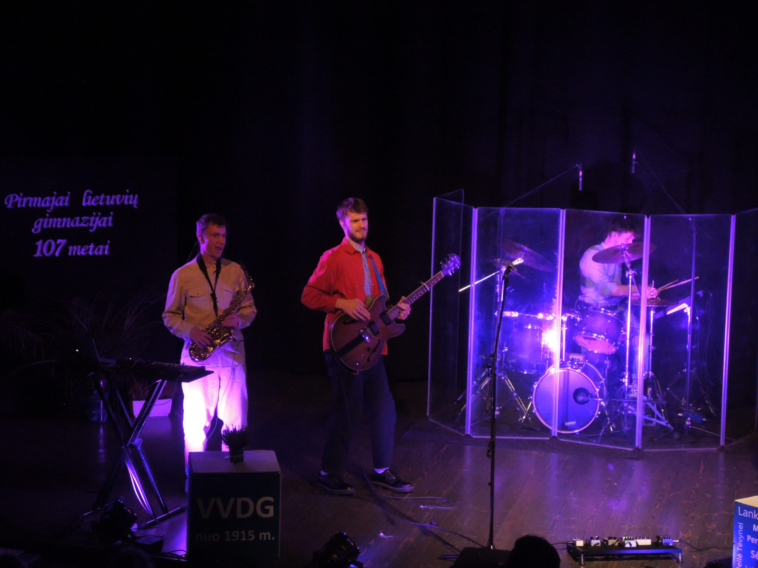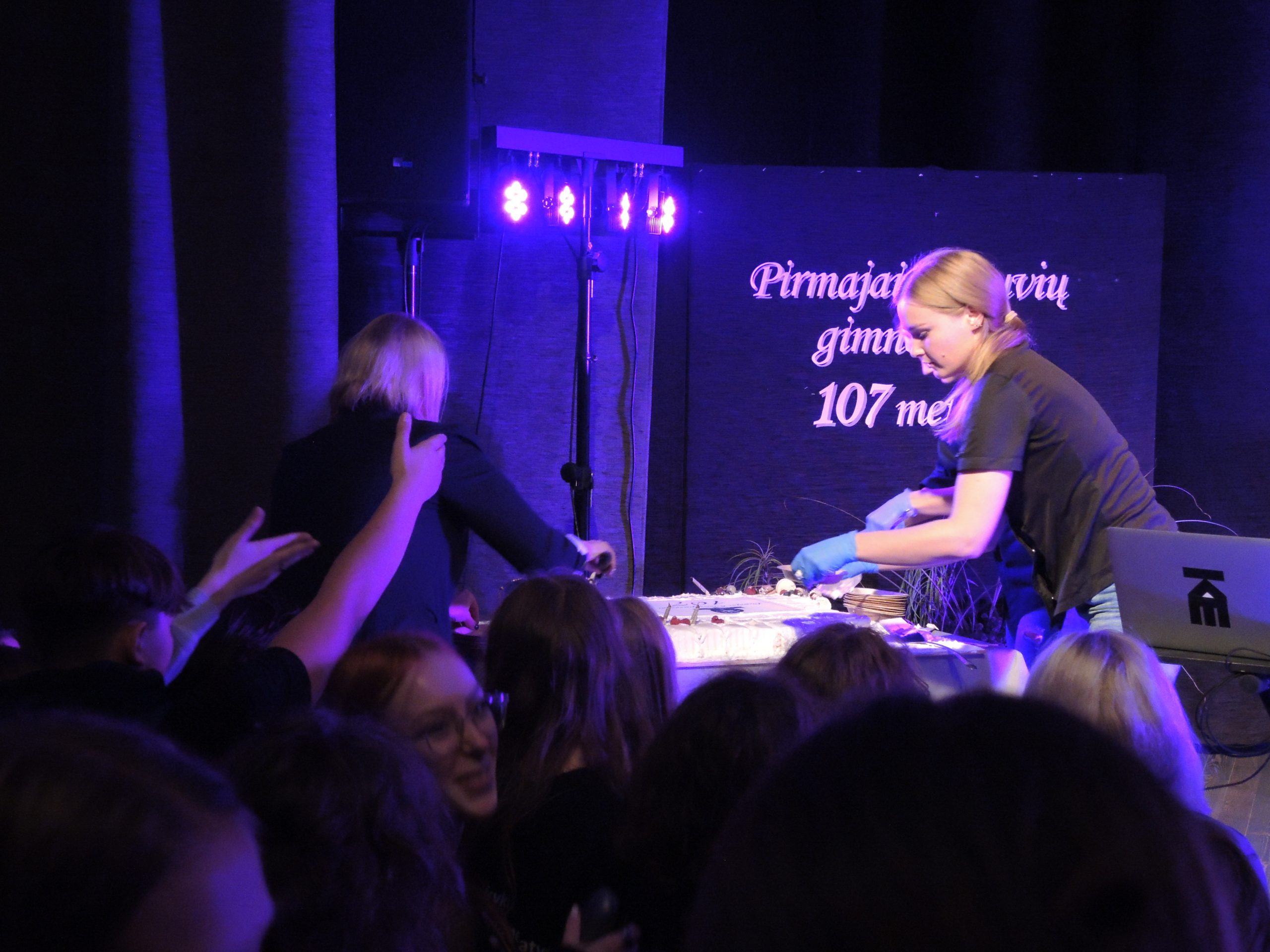 Antrąją renginio dalį užkūrė ir daugeliui mokinių nuostabą sukėlė scenoje pasirodžiusi mokyklos alumnų muzikos grupė „Kedrostubùras“. Vaikinai ant kojų pastatė ne tik gimnazijos jaunuolius – ritmingai kojomis trypė ir mokyklos mokytojai bei administracija. Kiek daugiau nei valandą trukęs muzikinis šou niekuo nenusileido kitiems šios grupės koncertams – aplinkui juos susispietęs linguojančių ir šokančių būrys sukėlė tikrą judesio bangą! Nusilenkę ir padėkoję atlikėjai buvo priversti dar kartelį atlikti vieną savo kūrinių dėl juos užplūdusios minios, skanduojančios „Pakartot!“. Galiausiai nuotaikingajam „Kedrostubùrui“ pasiekus scenos užkulisius, šauniųjų valgyklos darbuotojų pagalba buvo išdalinti didžiulio ir gardaus gimtadieninio torto gabalėliai.