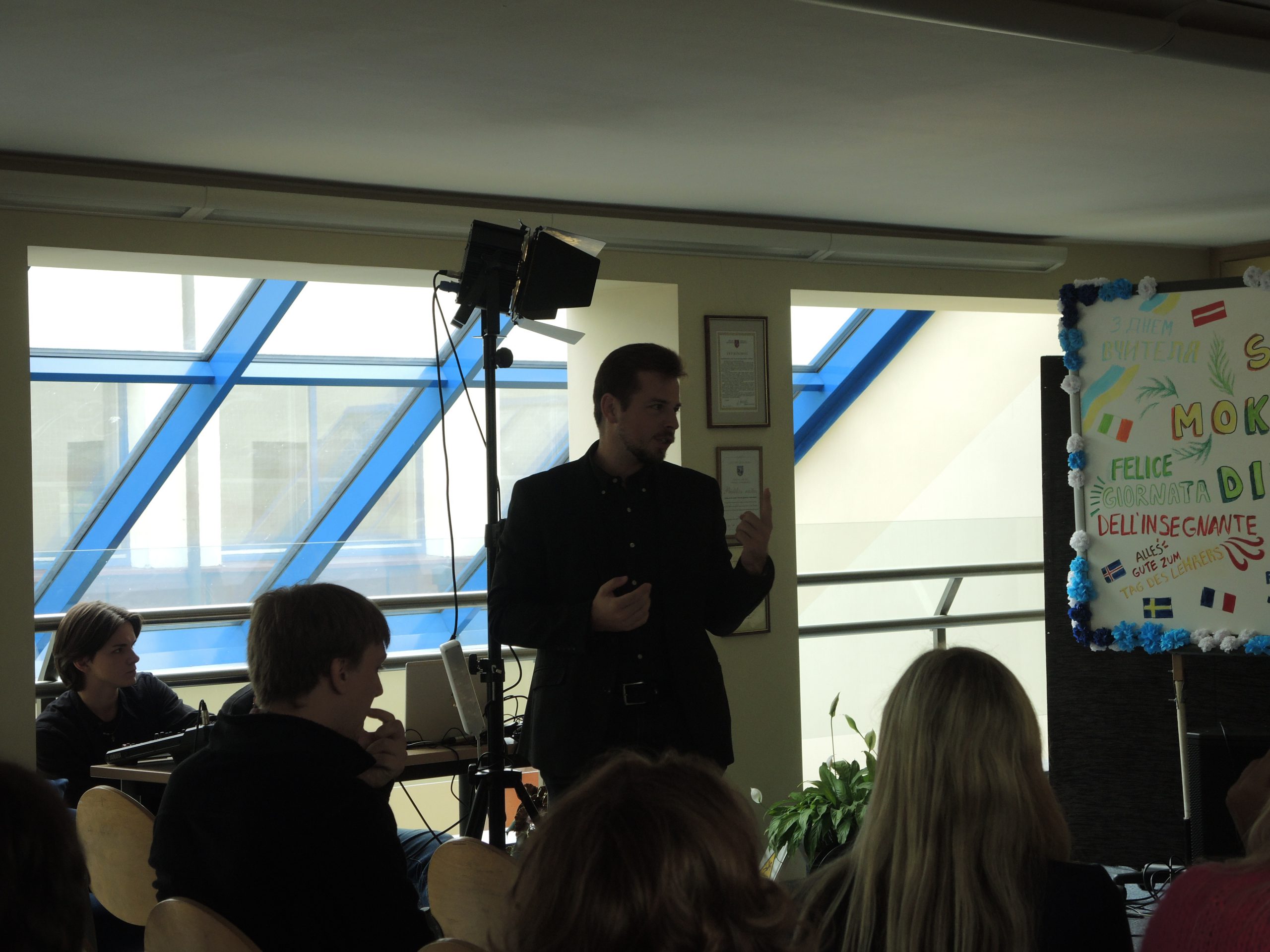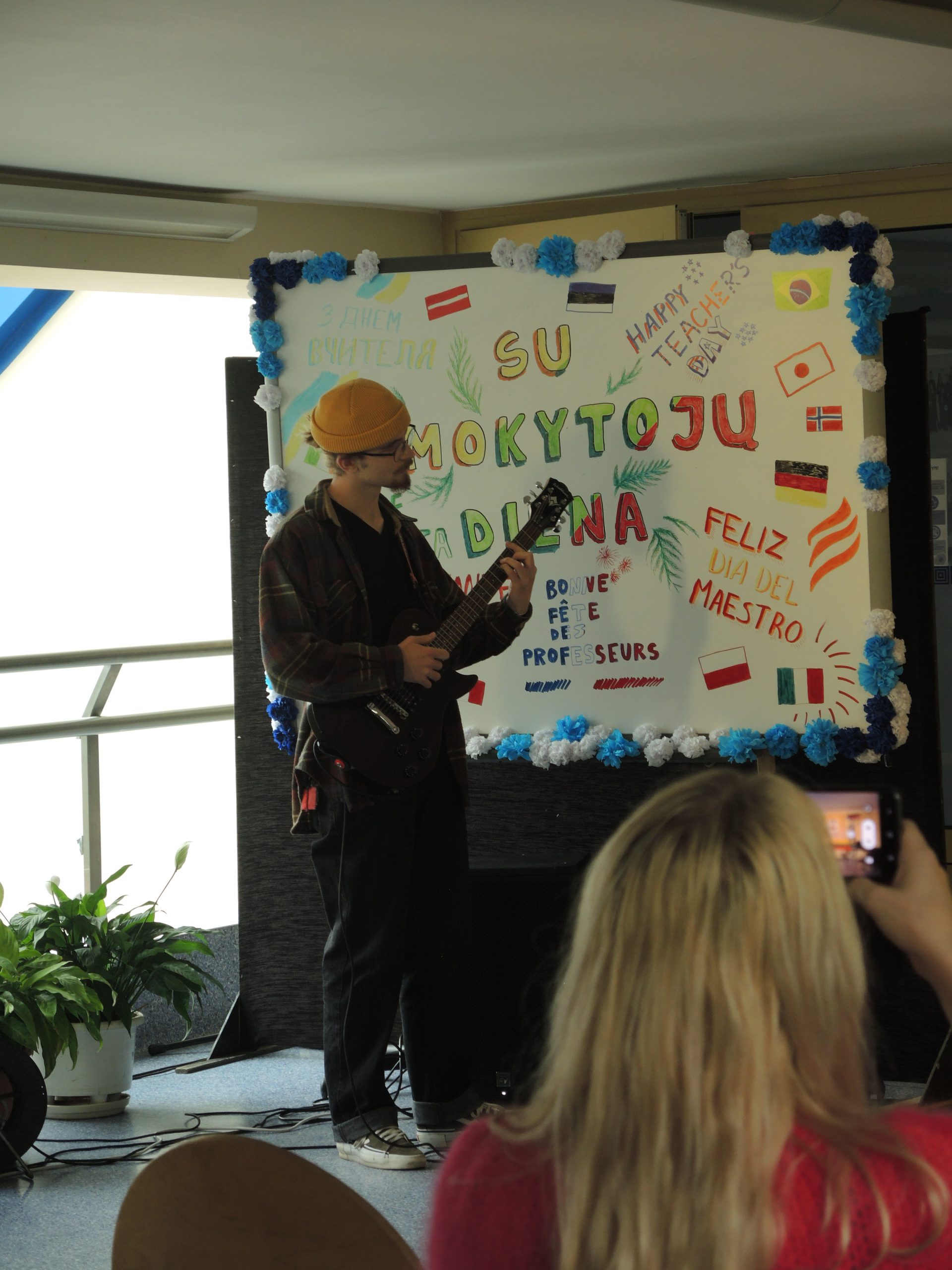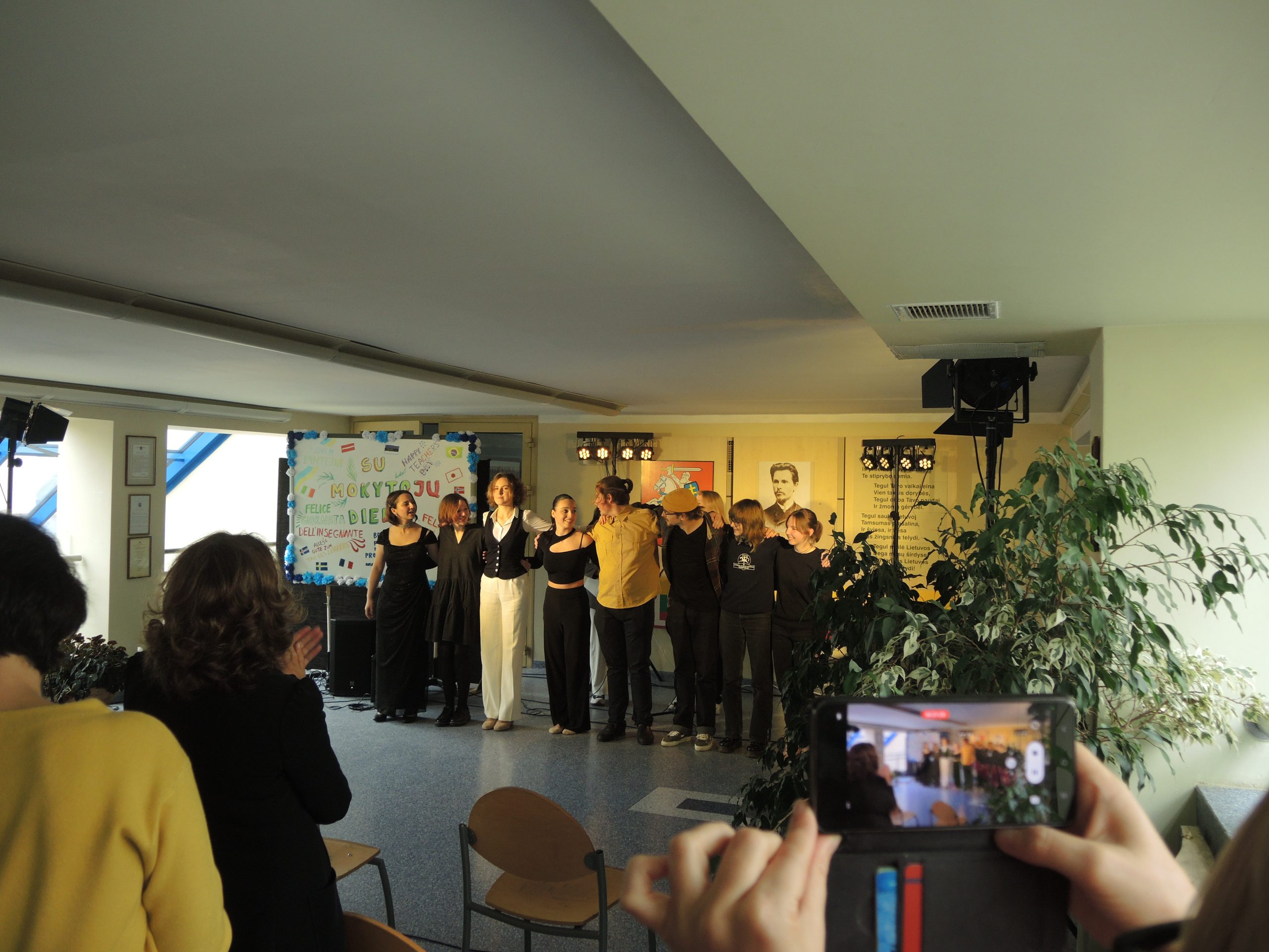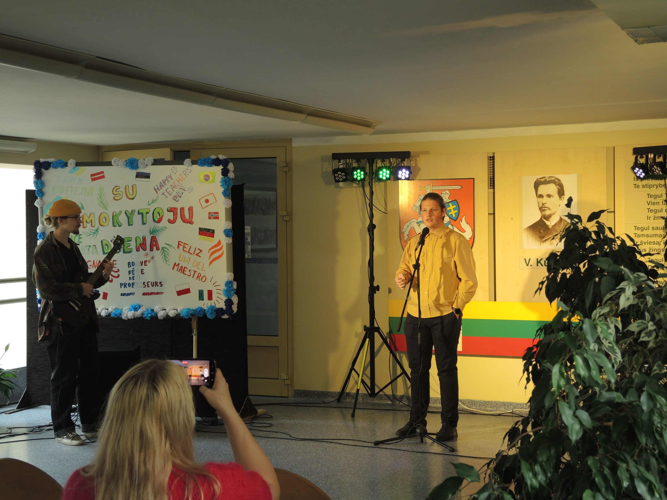 Vytauto Didžiojo gimnazijos mokytojams darganotą spalio 5 dienos rytmetį skleidėsi rožių žiedai, buvo atviras mokinių glėbys, o širdys pripildytos sveikinimų ir dėkingumo žodžių. Po šventinių vaišių abiturientai savo ugdytojus tradiciškai pakvietė į pačių organizuotą pamoką-koncertą. Dvyliktokai dovanojo savo pasirodymus, džiugino ne tik šmaikščiais, bet ir jautriais linkėjimais bei pažadais. Sušildyti mokinių dėmesio mokytojai leidosi į paslaptingą kelionę po XX a. istorinius ir kultūrinius labirintus drauge su spektaklio „Šimtmečio moterys“ veikėjomis, įkūnijusiomis žymias ir įtakingas to laikmečio visuomenės aktyvistes.