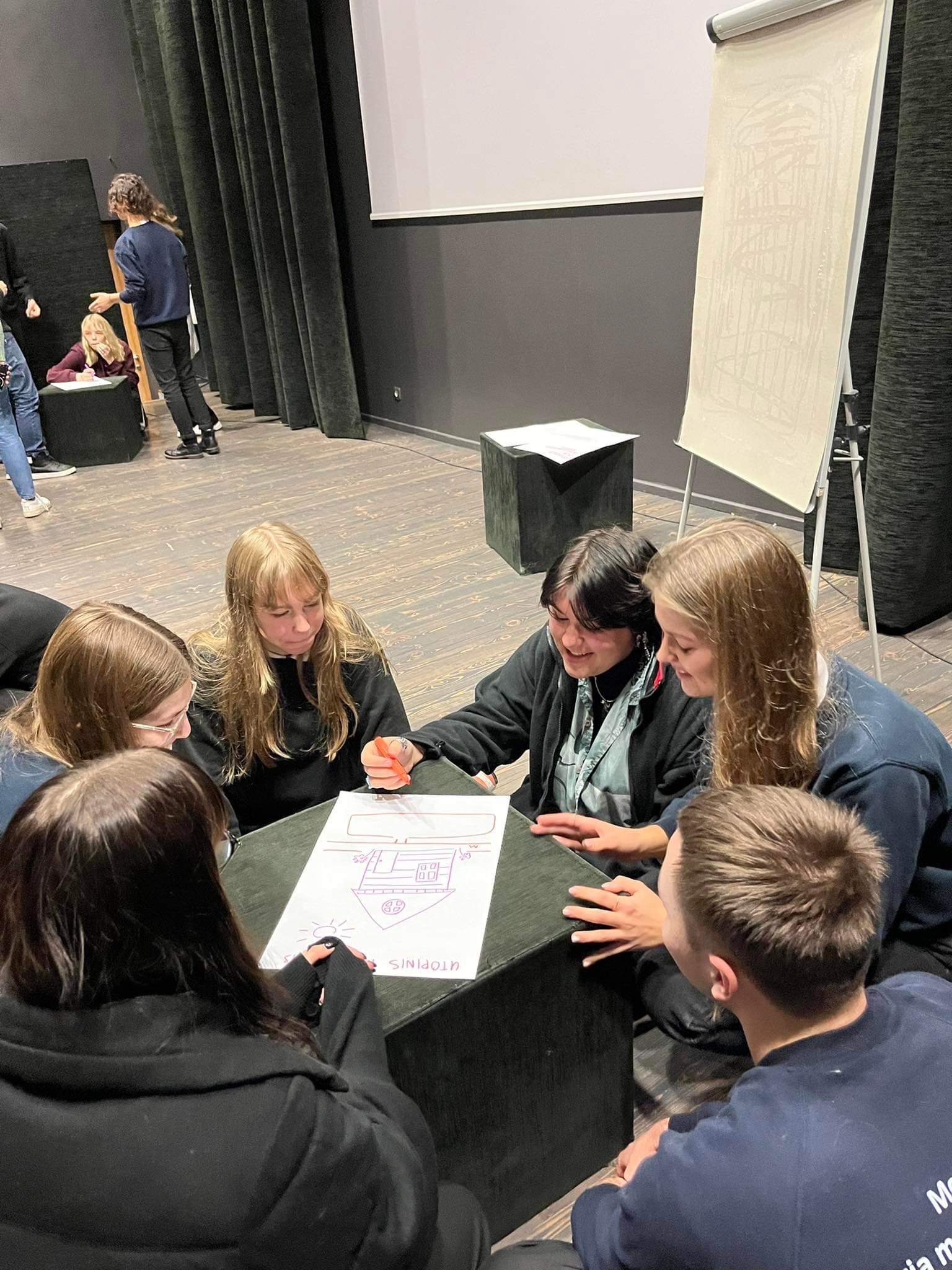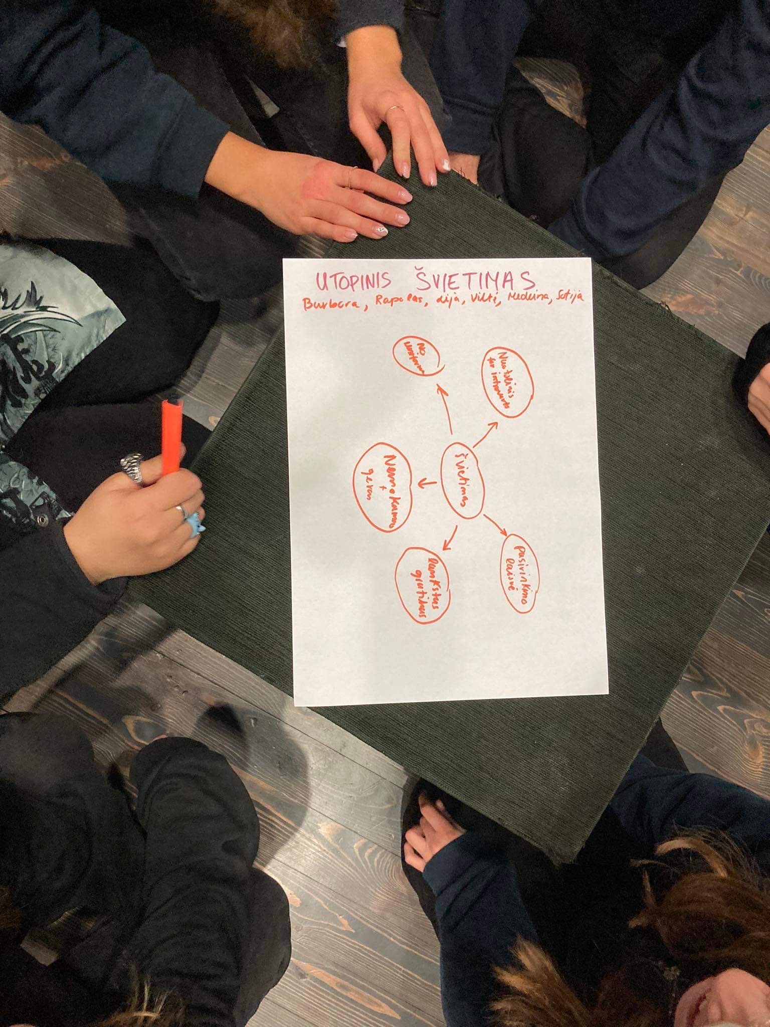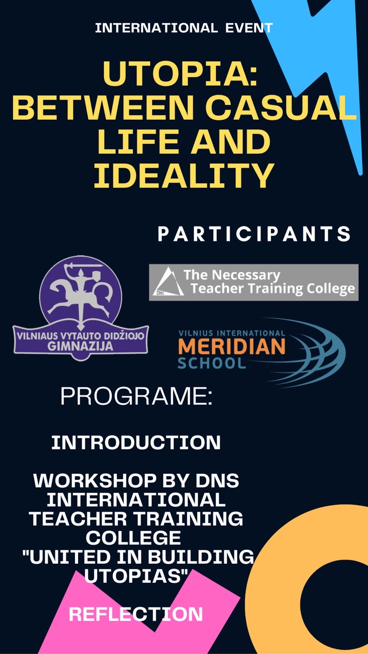 Bendradarbiaujant su DNS International Teacher Training College ir VIMS – International Meridian school mokiniais spalio 17 d. gimnazijos aktų salėje vyko tarptautinis integruotas renginys „Utopijos: tarp kasdienybės ir idealybės“. Gimnazijos alumnė Gabrielė Babravičiūtė, jau ketvirtus metus studijuojanti Danijos alternatyviame mokytojų rengimo koledže, mūsų abiturientus ir svečius įtraukė į interaktyvias veiklas, kurios yra ciklo „Vieningi kuriant utopijas“ dalis. Darbo grupėse jaunuoliai formavo utopijos, gvildeno atviros ateities bei pozityvios politikos sąvokas, tyrinėjo individualias, vietines ir pasaulines perspektyvas ir aptarė, kaip minėtus konceptus galima pritaikyti praktikoje.